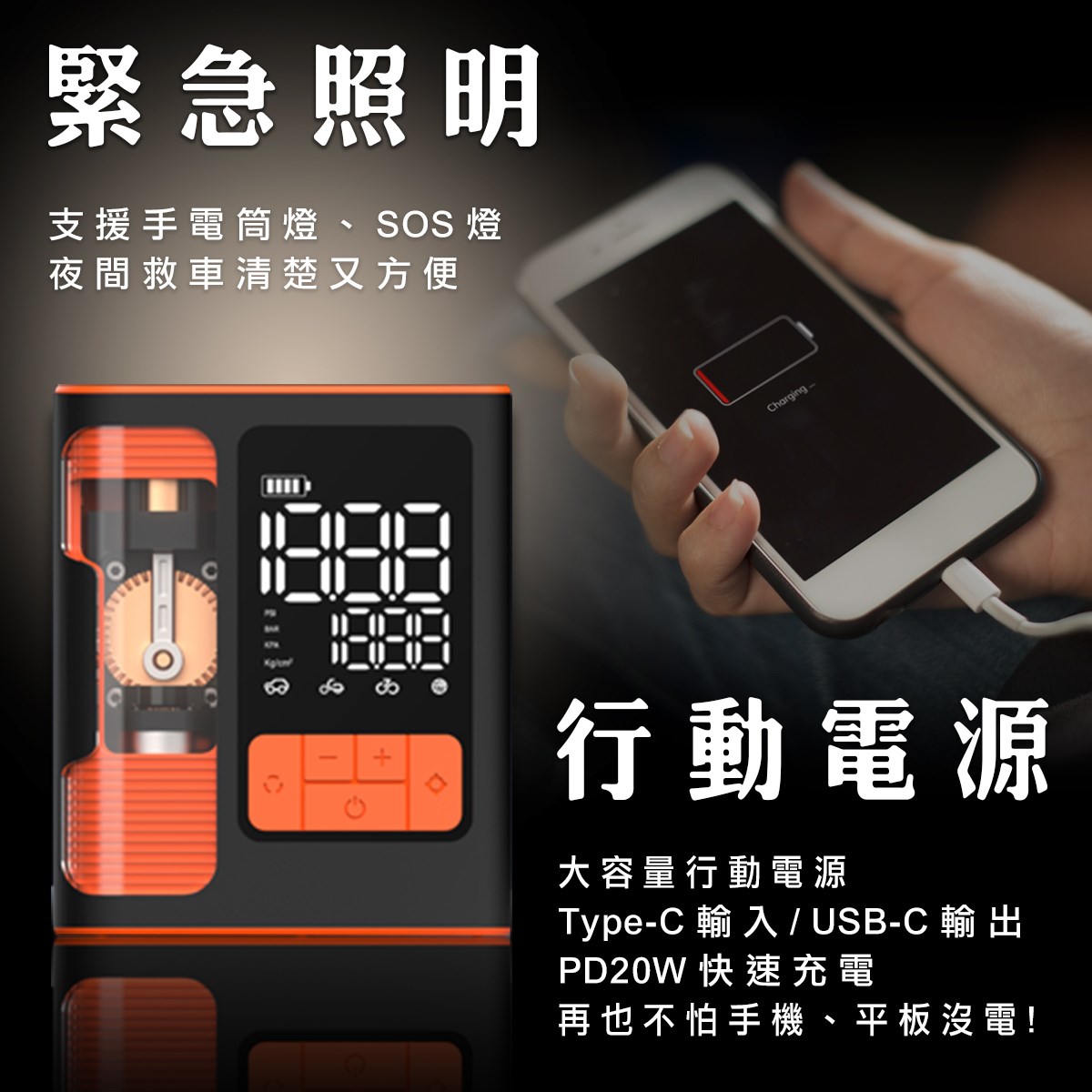 1.救車、充氣、充電、照明,一機滿足多種功能